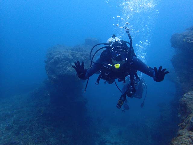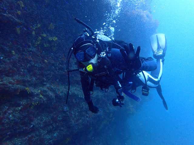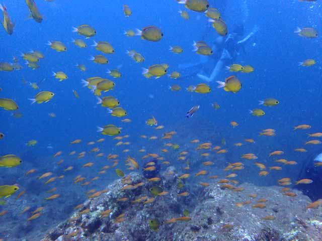 今回は金土の1泊2日で南紀田辺にファンダイブに行ってまいりました! (^ー^)> 10/24金は夕方南部のお宿の「ホテルあさひろう」さんにチェックインした後、夕食は近くの美味しい居酒屋さん「万作」に皆で繰り出しました。 そして「万作」の美味しいお料理をいただきながら、明日からの田辺でのダイビングのお話に花を咲かせて、夜は早めに休ませていただきました(^^) ![]() ![]() ![]() ![]() ![]() ![]() ![]() ![]() ![]() 次の日の10/25土、さぁ!潜るでぇ〜!!と張り切って出港しました(^^)v 左からU田さん、A子ご主人、A子奥様(カメラのレンズに水滴が付いていたみたいで本当に申し訳ありません!m(==)m) と言うことでこの日は「南部出しアーチ」と、「ショウガセ」の2ボートダイブを楽しんできました。 海に飛び込むと透視度も良くメッチャ気持ち良い〜!そして海の中の生物がいっぱいで今回もメッチャ癒される〜!でした(^^)v そして偉大な黒潮がまだまだ夏の海にしてくれていて、水温は25〜26度もあるのでウエットスーツで快適にそして気持ち良く潜って来ましたよ〜(^^) どういう風に快適に気持ち良かったのか?癒されたのか?「百聞は一見に如かず」、この下に写真を貼り付けたのでぜひ観て下さい!m(^−^)m 1本目は「南部出しアーチ」 ![]() ![]() 最近名物の水路にはニザダイが群れています(^^) ![]() その水路を通過中のA子さんご主人(^^) ![]() ![]() そのニザダイの群れを撮影中のA子さん奥様(上)とU田さん(^^) ![]() ![]() ![]() 名物のアーチを通過中のU田さん(上)とA子さんご主人と奥様(^^) ![]() アーチの中にいたレンテンヤッコ(^^) ![]() ![]() スリバチサンゴにアシビロサンゴヤドリガニが(^^) 上の写真はスリバチサンゴに穴をあけて潜んでいる時と、下は穴から出てきた時で、写真に撮るとメッチャ綺麗なカニです(^^)v ![]() ウミシダにコマチコシオリエビが(^^) ![]() ![]() ![]() 透視度が良かったのでみんなで根の周りを気持ち良く遊覧飛行です(^^) 上からA子さんご主人、奥様、U田さん ![]() ![]() 根の上はソラスズメダイとキンギョハナダイとソフトコーラルが美しかったです(^^) ![]() 最後は根の上でマツバギンポと安全停止です(^^) 2本目は「ショウガセ」 ![]() ![]() ただ今「ショウガセ」の根の周りや上はコガネスズメダイやキンギョハナダイの群れがとっても美しいです(^^) ![]() ![]() ![]() 「ショウガセ」の豪快なドロップオフを気持ち良く遊覧飛行中の、上からA子さんご主人、奥様、U田さん(^^) ![]() ![]() ドロップオフの雰囲気のあるソフトコーラルとタキゲンロクダイ(^^) ![]() と、突然イサキとメジナの大群が!(^^) ![]() と、彼らを撮影せんとU田さんが突撃!(^^) ![]() ![]() ![]() 根の上のイソギンチャク畑ではめっちゃ可愛いサイズのミツボシクロスズメダイやクマンミやカザリイソギンチャクがいっぱいでメッチャ癒されました(^^) ![]() 最後はみんなでご機嫌さんで安全停止です(^^) と言うわけで、今回も心身ともにエエように癒されました(^−^) このように、これから近場の海はこんな感じのメッチャ気持ち良いベストシーズンに突入です。 ぜひみなさん近々このメッチャ気持ち良い海にご一緒させて下さいね〜!! (^−^)> |