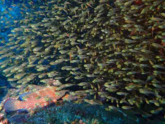 サンゴ根にキンメモドキの大群と彼らを狙うユカタハタ(^^)