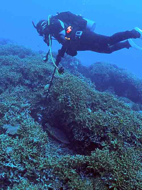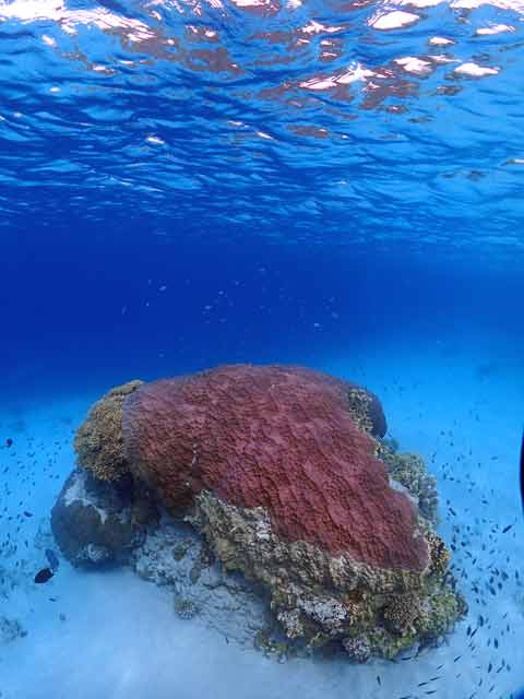 サンゴ根の上でしきりにサンゴをかじっていたタイマイ。最後は水面に呼吸をしにゆっくりと上がっていきました(^^)