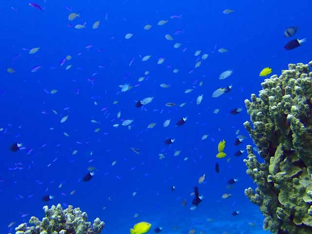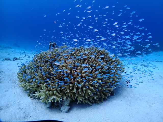 そしてサンゴ礁の上にはオキナワスズメダイとデバスズメダイがワンサカ(^^)