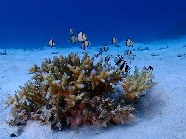 座間味島の南側のポイントで、砂地と小さなサンゴ根が点在する海底を進んでいくと、ユビエダハマサンゴの大きな群生がありました。その群生には色んな生物が棲んでいて、彼らを見ているうちに、やっぱり癒されてしまいました(^^)
