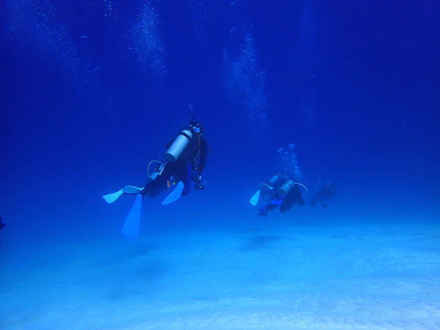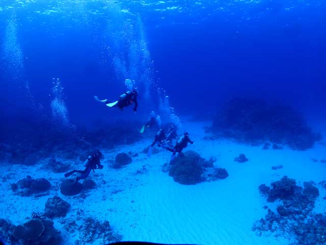 真っ白い砂地のスロープを下って行ったのですが、ブルーのグラデーションがメッチャ美しかったです。それに我々の影が真っ白い海底にクッキリと(^^)