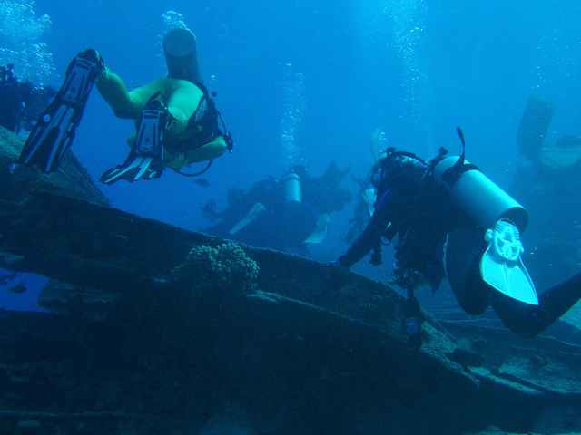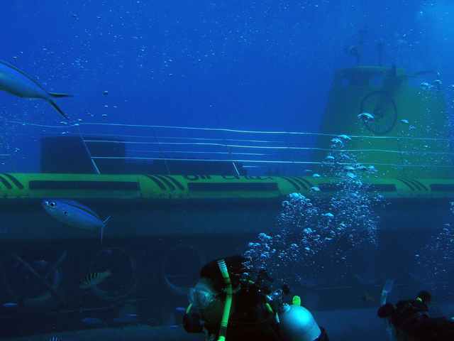 そうそう沈船に潜っていると、急にイエローサブマリン(観光用)が登場してびっくりしました。中に乗っているお客さんが手を振っているのが見えましたよ。でも僕達には彼らが宇宙船に乗ってきたエイリアンのように見えたのですが彼らの目には我々ダイバーがどのように映ったのでしょうか?