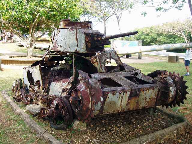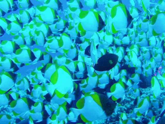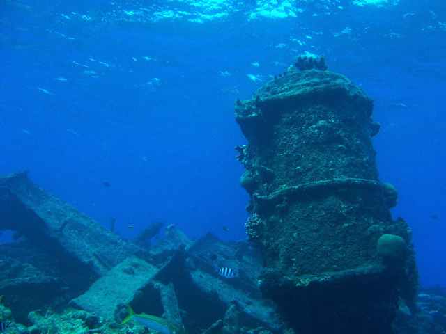 「沈船」サイパン島とマニャガハ島のちょうど中間の-10mの海底に全長60mほどの輸送船が沈んでいました。60年と言う長い月日がこの鉄の塊をサンゴのオブジェに変えてしまいました。このオブジェを住家にしている魚も多く、ボスのような大きなバラフエダイをはじめ、アカヒメジやアカマツカサ、ヨコスジクロダイやロクセンスズメダイの群れ、コガネヤッコやマダラタルミの幼魚にナンヨウハギなど、そして周りの砂地には日本のクビアカハゼの親戚レッドバンテッドシュリンプゴビーなどが仲良く住んでおりました。