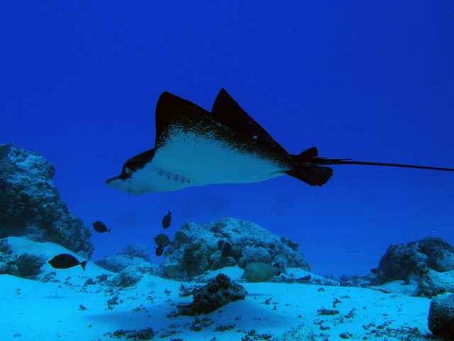 「アイスクリーム」ここは今回2度潜ったのですが、-16mの平坦なサンゴと砂地の海底に大きなアイスクリームのような岩があるのでその名前が付いたそうです。ここのスペシャルはマダラトビエイがこのアイスクリームの根に現われるので有名で今回も2度とも編隊を組んで颯爽と登場してくれました。マダラトビエイはマンタと同じく羽ばたくように泳ぐエイの中でも最も美しいと言われるエイで顔がシャープなのと泳ぎ方が鷹に似ていると言うので付いた英名はイーグルレイ。本当にカッコよかったですよ!