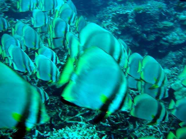 ゴロタとサンゴのスロープでは、アデヤッコ、ワヌケヤッコ、エイブルエンジェルフィッシュなどのキンチャクダイの仲間、パウダーブルーサージョンフィッシュ(ハギの仲間)やコラーレバタフライフィッシュ、アンマダンバタフライフィッシュなどのチョウチョウウオの仲間など色取り取りの熱帯魚に囲まれました。