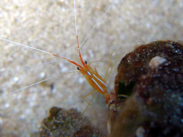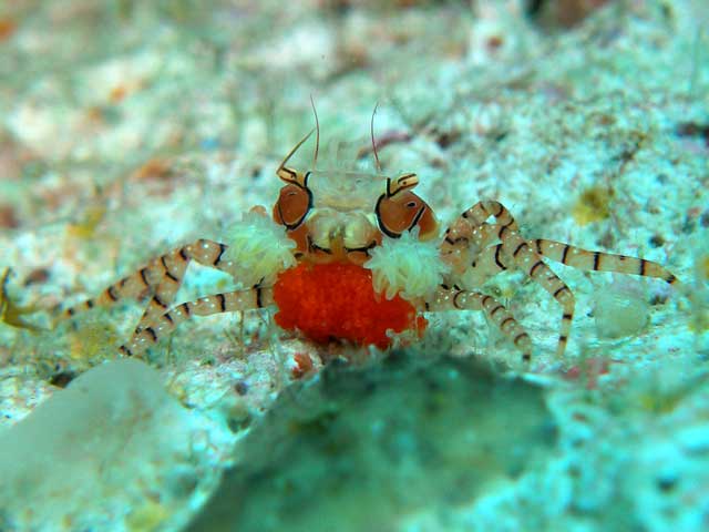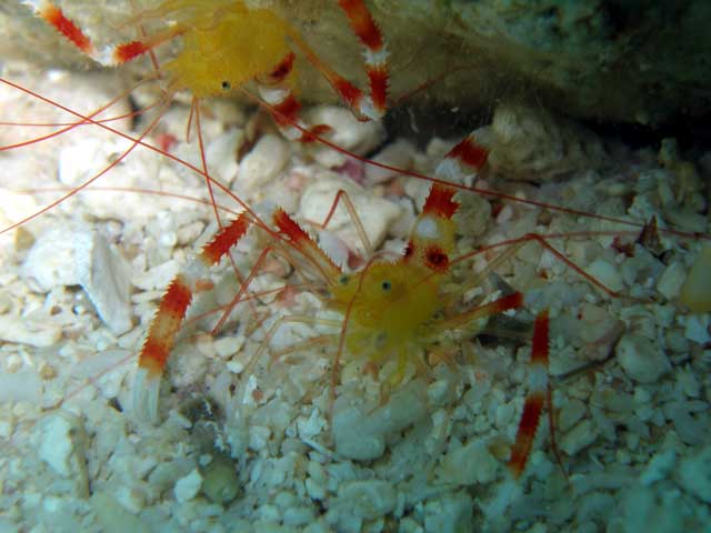 ガレをめくると出てくる出てくる。フリソデエビのペアー、卵持ちのキンチャクガニ、ウルトラマンのウミウシカクレエビ、怪しい中国人のワライボヤ、イエローボクサーシュリンプ、そしてバイオレットボクサーシュリンプ(K池さんが見つけた!)が次々に出てきました。