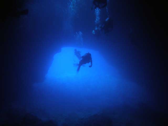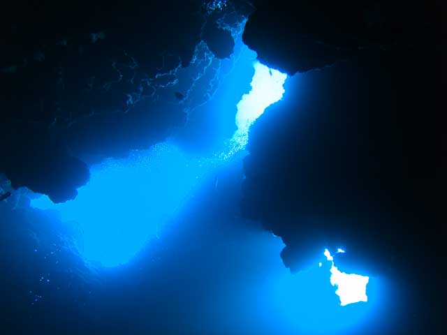 下方の穴からいよいよ一ノ瀬のメインホールに入っていきました。最初は真っ暗でしたが、すぐに前方に群青色の大きな穴が輝いておりました。