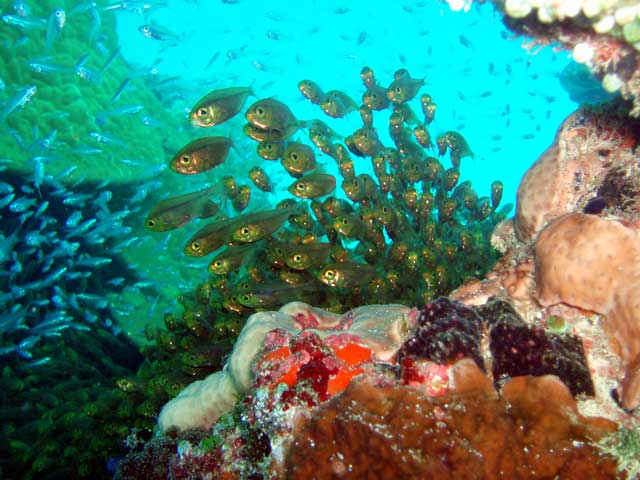 サンゴ根にはお約束のキンメモドキやスカシテンジクダイの大きな群れ、カラフルなキンギョハナダイやケラマハナダイ、そして彼らを狙うユカタハタやミノカサゴ達がええ感じでした。