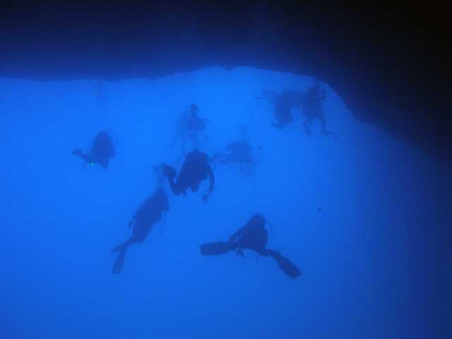 小さな穴を抜けると天井が大きく開いた明るいホールに出てきました。この日は透明度が抜群で、ホールの中層に浮かんでる皆さんがお天道様の光を受けてとってもええ感じでした。