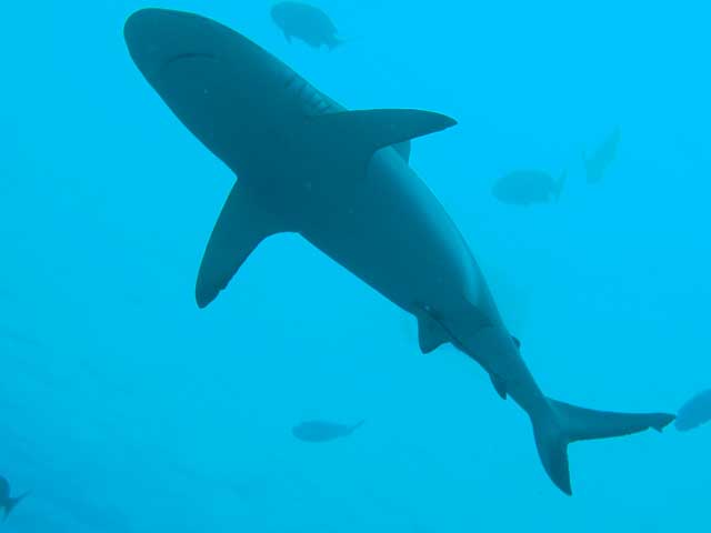 その後は、ギンガメアジ、クロヒラアジ、マダラタルミの大群、クマザサハナムロやウメイロモドキなどのグルクンの仲間達の大群、そして彼らを狙ってグレイリーフシャークやホワイトチップが音も無く?不気味にそしてかっこよく通り過ぎていく、いつものブルーコーナーを楽しみましたよ(^^)v