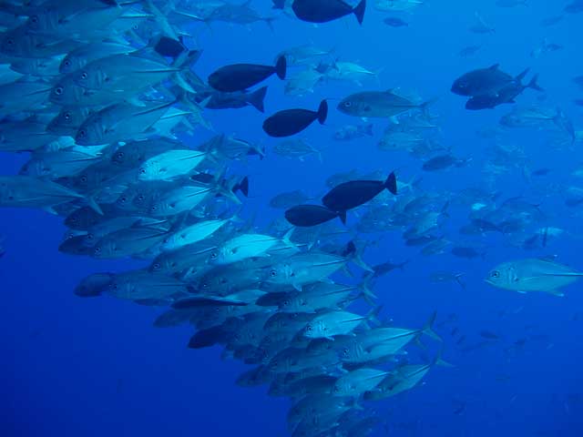 ひとしきりマンタを眺めた後、われわれの目の前にナポレオンやグレイリーフシャーク、やギンガメアジやマダラタルミの大群やバラクーダーやオオメカマスの大群などが、わざわざブルーコーナーからジャーマンチャネルを通って我々を見送リに来てくれました(?)