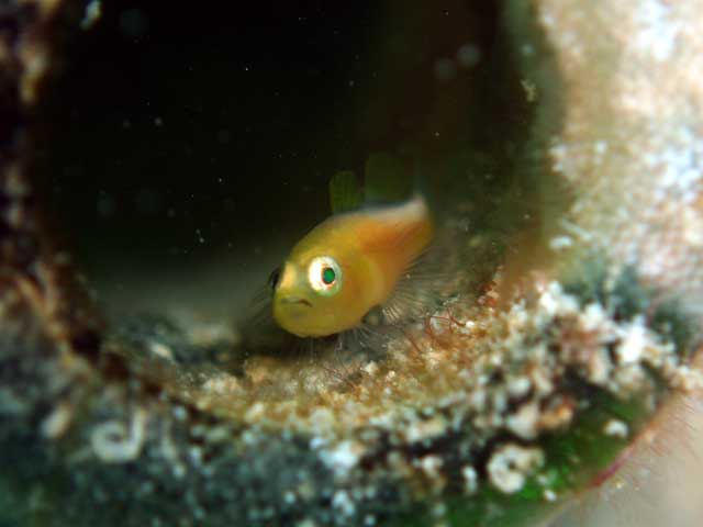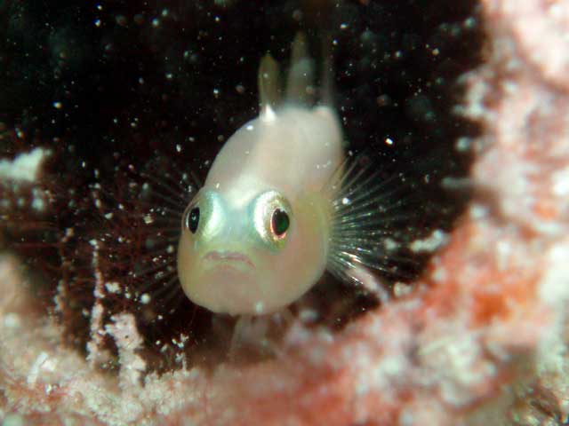 サンゴ礁から砂地のスロープをゆっくり下っていくと、約-25mあたりに空瓶があちこち散乱していて、そのひとつひとつにいっぱいのナカモトイロワケハゼが棲み付いていました