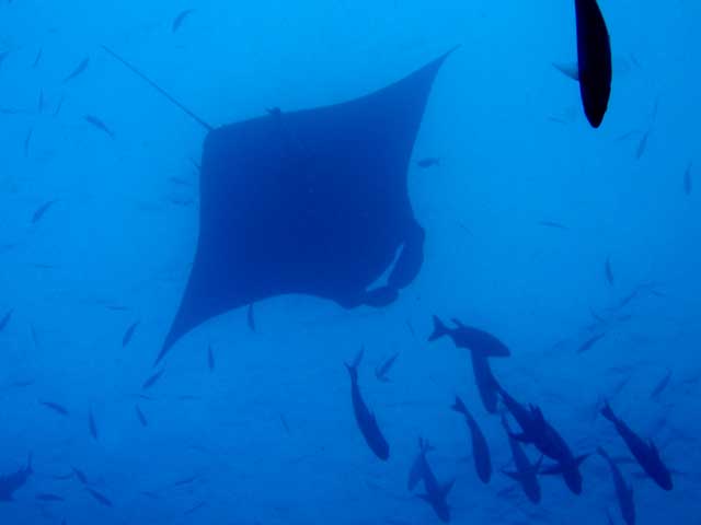 暫く待っていると、「で出た〜!」われわれの真上に大きなマンタが2枚、何度も行ったり来たりしてくれました。