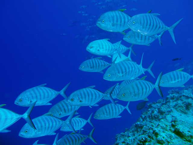 先ず、棚の上に潜行して、ドロップオフから群青色の沖の中層にみんなで泳ぎ出ました