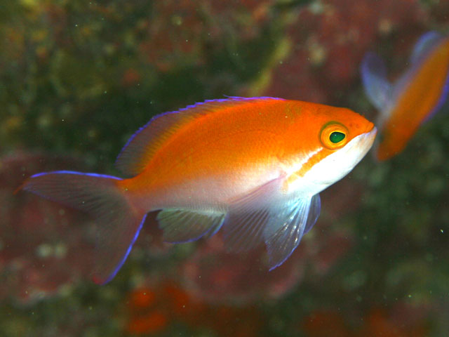 彼らを掻き分け、根の壁沿いに深度を落としていくと小さい根が現れその周りにキンギョハナダイとケラマハナダイの幼魚の群れにアサヒハナゴイが2匹紛れていました。