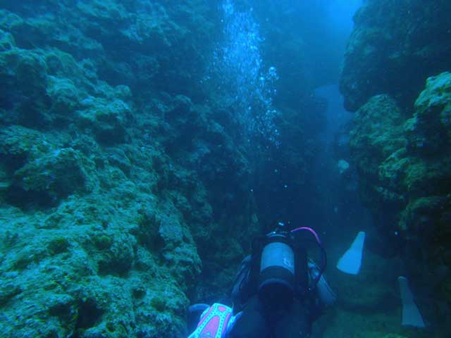 ここは、瀬底島の西側のポイントで、豪快なドロップオフと見事なサンゴ礁とそして洞窟やトンネルが売りのポイントです。